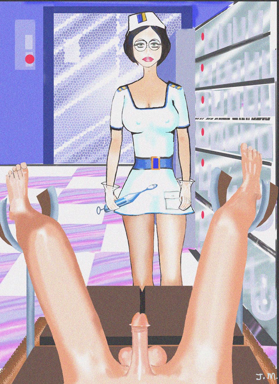 “Oh… look miss… er nurse. Some fluid has come out of his penis and I can feel it throbbing. Shall I stop stroking him, erm… inside him I mean?”