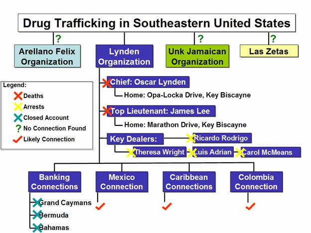 Special Agent Valiant looked again at the listing of dead and missing persons. “The first incident was at the legal office of an attorney suspected of laundering funds for the Oscar Lynden Organization,” she mumbled aloud. “Only one body had been found in the charred remains of the office structure, Nathanial Itzel Archibold, the attorney. His paralegal and secretary were never found.” She traced her fingers across the drug trafficking chart she had built. “Then, just days later, the Lynden Organization virtually ceases to exist. Oscar Lynden, his primary lieutenant James Lee, and at least six of his enforcers die at two different locations in the Miami area.” Her other interconnection diagram had confirmed ties within the Lynden Organization to key area dealers, banking connections, and Mexican, Caribbean , and Colombian connections. “The part that bothers me is that supposedly they had a run in with an expansion of the Arellano Felix Organization of Mexico who released their enforcers, the Las Zetas, on them. There is just no substantiation of that theory. I haven't found a single connection between the Lynden Organization and Arellano Felix, Jamaicans, or Las Zetas. This just looks fishy to me.”